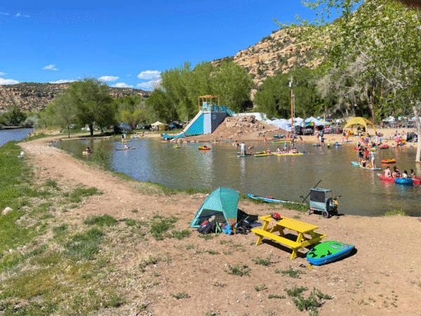 The main gathering place for the event is the beach area – perfect for all ages, with great swimming near the main stage. There’s also a giant water slide jump, and plenty of room for frisbee, lounging and water play.